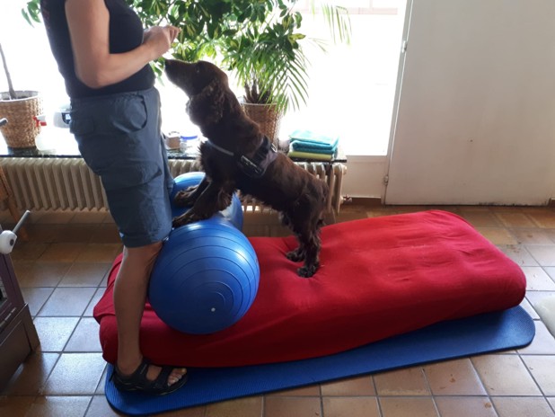 Gerätetraining und Isometrische Übungen werden für Muskelerhalt, Muskelaufbau und verbesserte Stabilität des Körpers eingesetzt. Kombiniert mit Geräte- und Balancetrainig erreicht man eine verbesserte Mobilität und Trittsicherheit. Gerne zeige ich Ihnen isometrische Übungen, Geräte-und Balancearbeit, als Hausaufgabe, angepasst an Ihren Hund. Auf dem Bild sehen Sie Balancearbeit mit dem Hund.